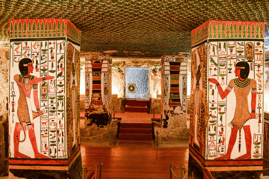 Unlike pyramids, these tombs were carved deep into the rock to protect royal treasures. Their walls are richly decorated with colourful scenes from ancient funerary texts, depicting the journey to the afterlife. Each tomb varies in design, scale, and artistic detail.